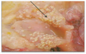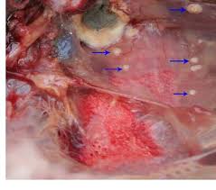 - Các hạt này có thể thấy trong túi khí ở ngực, bụng và đôi khi ở các cơ quan nội tạng. Khuẩn lạc màu vàng lục, hơi dẹp, phẳng hoặc lõm xuống, rắn chắc, rời rạc hoặc chồng đống lên nhau bám chặt vào cơ quan nội tạng nói trên.