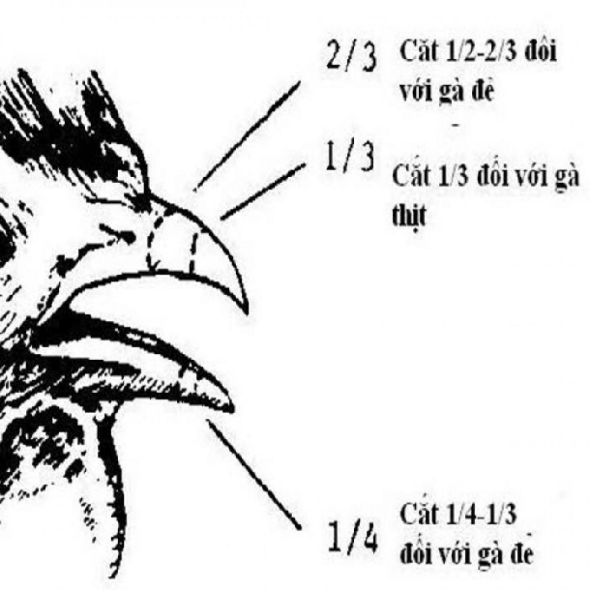 - Với gà hậu bị cắt lúc 7 -8 tuần tuổi hoặc 12-16 tuần tuổi. Cắt cả 2 mỏ, vết cắt vuông góc với trục mỏ, mỏ trên cách lỗ mũi 6mm, mỏ dưới xa hơn mỏ trên 3mm, tạo cho mỏ dưới dài hơn mỏ trên. Cũng có thể xác định vị trí cắt mỏ trên là điểm giữa bờ lỗ mũi và chóp mỏ, còn mỏ dưới vẫn cắt dài hơn mỏ trên 3mm.